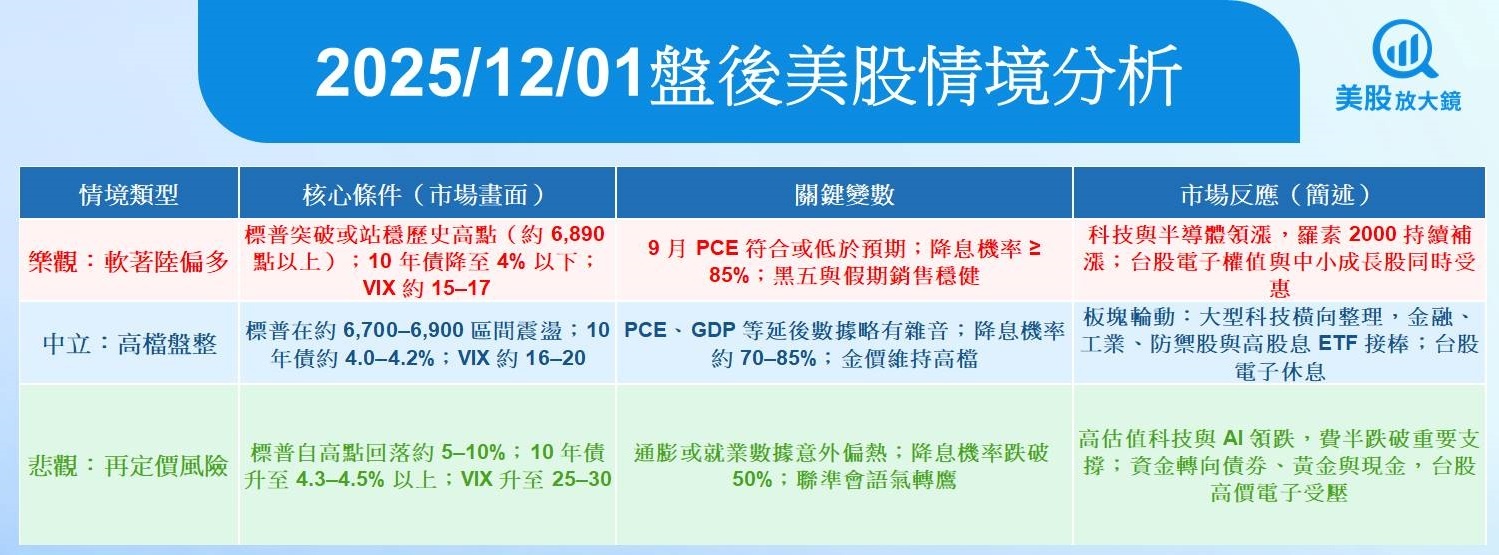 真正關鍵的硬數據(9 月 PCE、延後的 GDP、往後的 CPI/就業報告)集中在 12 月上旬~中旬公布,若通膨或成長任何一邊明顯偏熱,降息預期可能被快速修正
