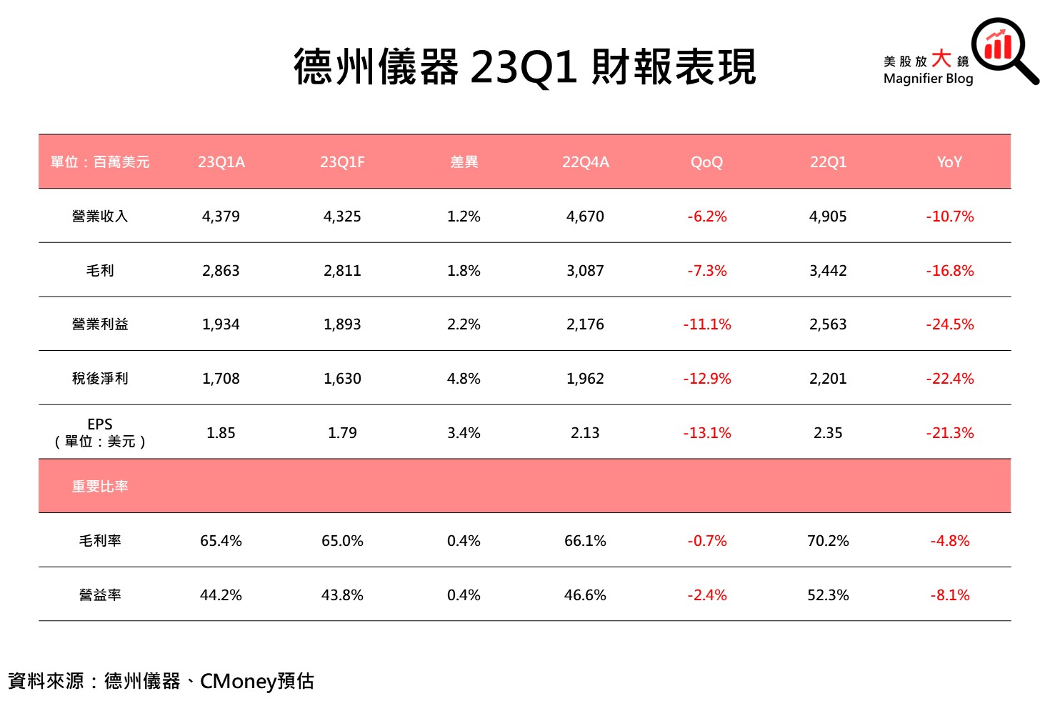 德州儀器公告23Q1財報,營收43.8億美元(QoQ -6.2%、YoY -10.7%),較CMoney研究團隊預估高1.2%,並與市場預期相符;毛利率季減0.7個百分點至65.4%,營益率季減2.4個百分點至44.2%,均為兩年來新低,稅後淨利17.1億美元(QoQ -13.1%、YoY -21.3%),EPS 1.85美元。