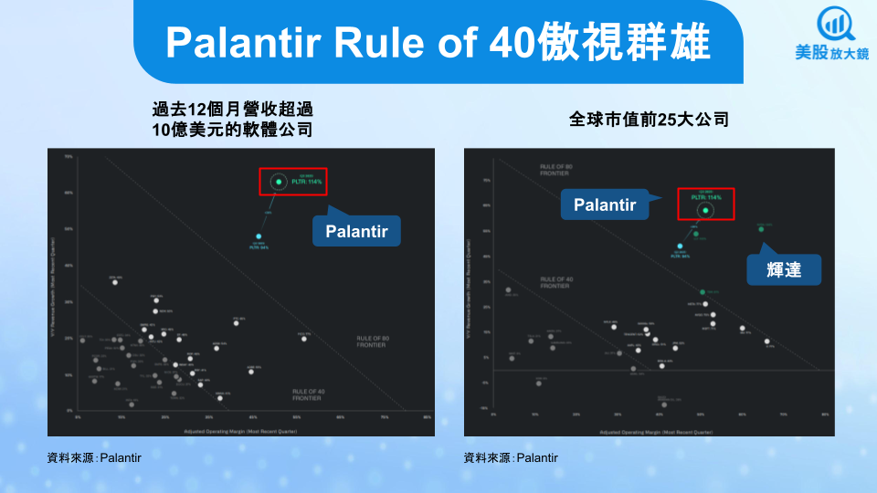 Palantir 將 2025 全年營收從原先預估的 41.42 ~ 41.50 億美元上修至 43.96 ~ 44.00 億美元(年增 54%);營業利益從 19.12 ~ 19.20 億美元上調至 21.51 ~ 21.55 億美元。公司積極控制人事成本,在極小規模銷售團隊下創造了 Rule of 40 高達 114% 的成績,顯示其商業模式具高效率、高槓桿的特質。