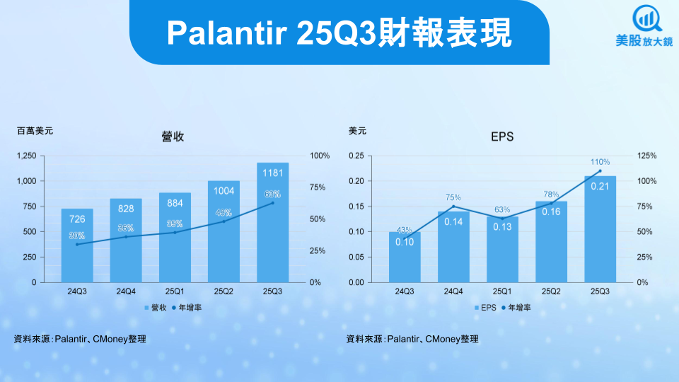 Palantir 25Q3 繳出堪稱「爆炸性」的成績單:營收達 11.8 億美元,季增 18%/年增 63%,大幅優於市場預期的 10.9 億美元;EPS 0.21 美元,優於市場預期的 0.17 美元。Rule of 40 來到 114%。綜合來看,美國市場仍是主要成長引擎,佔整體營收 75%,其中: