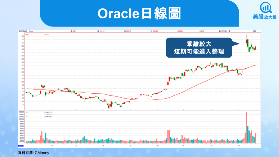 從股價日線圖來看,目前距離 50 日均線(紅線)乖離較大,短期可能進入消化獲利了結賣壓的整理期,但在基本面強勁下,可能以盤代跌,290 美元沒破,可能是逢低買進的關鍵位置。