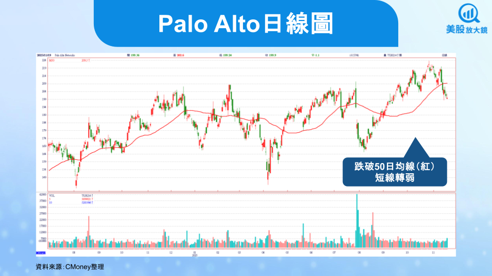 另外,Palo Alto 股價已跌破 50 日均線,為短期轉弱現像,且在目前估值水位偏高的前提下,投資人應先行觀望較佳,等待財報中能見度提升與具體成效出現後再重新評估是否進場。