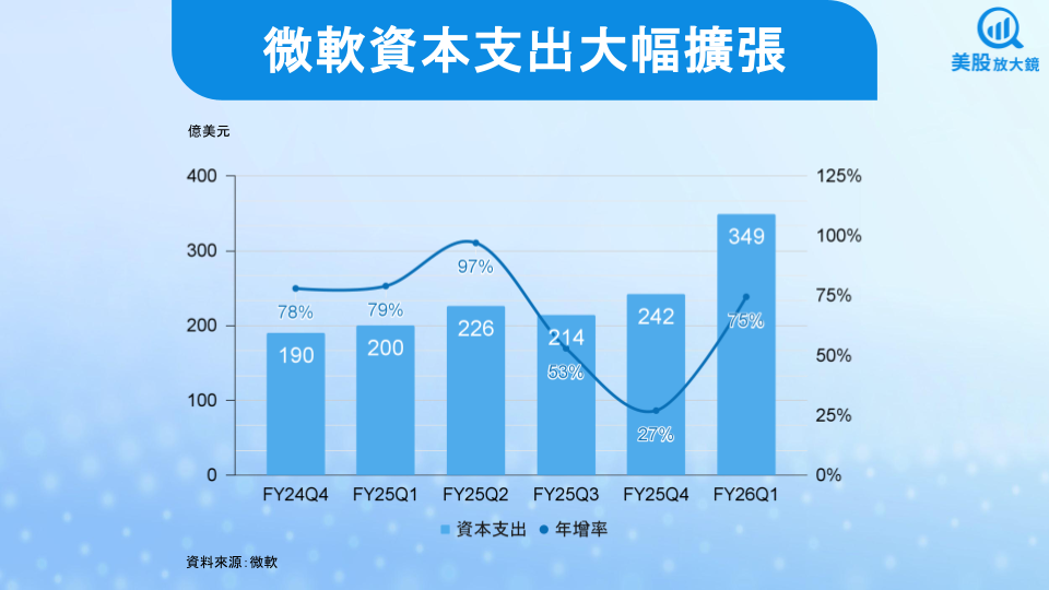 在成本方面,公司預計毛利率將小幅下降至 66%,反映 AI 投資與雲端營收比重上升。FY2026 全年資本支出成長率預期高於 FY2025,顯示微軟正加快 AI 基礎設施建置,以因應爆發式的企業 AI 導入潮。
