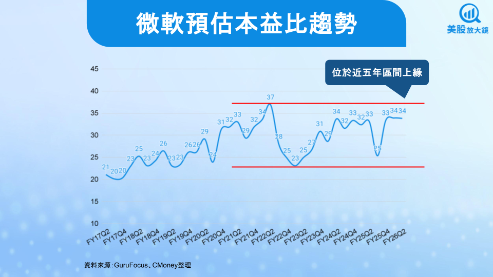 以目前股價約 541.55 美元計算,未來四季 EPS 預估為 16.02 美元,本益比約 34 倍,仍處於近五年區間上緣。隨著 AI 應用逐步商業化與雲端效率提升,估值具中期上行空間。短線股價回檔更多反映投資人對高資本支出與算力供給的短暫疑慮,而非基本面轉弱。