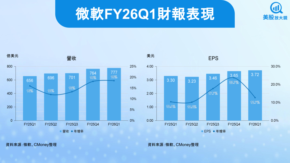 微軟 FY26Q1 營收達 777 億美元,年增 18%,優於市場預期的 754 億美元。雲端服務為主要成長來源,營收達 491 億美元、年增 26%,其中 Azure 營收增長 40%,顯示生成式 AI 與企業運算需求強勁。OpenAI、SAP 等大型客戶的高運算工作負載持續推升雲端使用率,公司剩餘履約義務(RPO)攀升至 3,920 億美元,年增 51%,其中約 80% 將於兩年內實現。