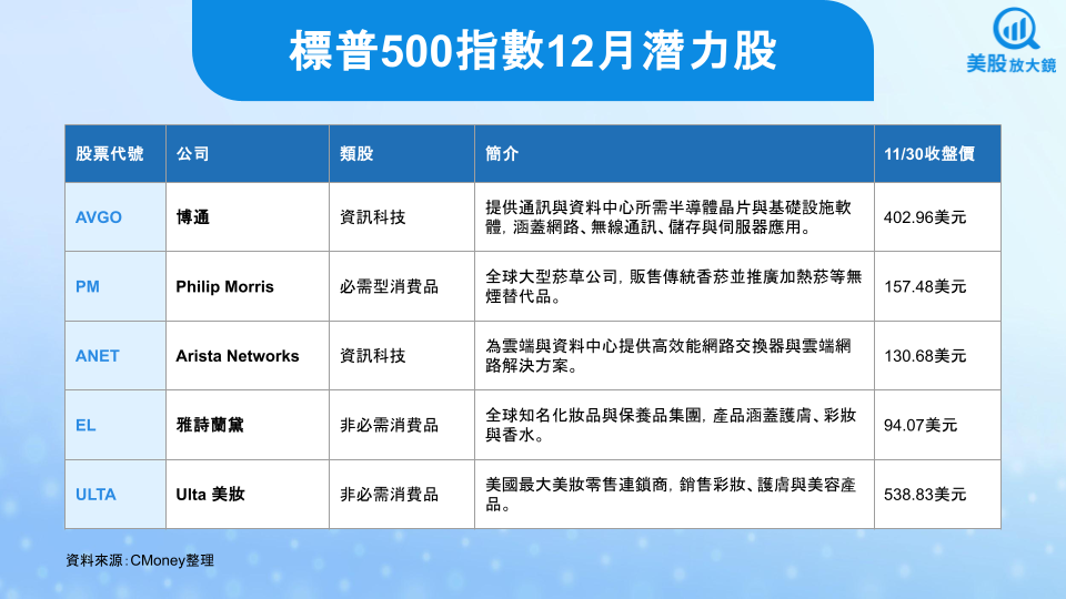 在上一篇【關鍵趨勢】標普連7個月上漲!11月風雲榜有誰?我們回顧了 11 月主要權值股及強勢股表現。展望 12 月,美股迎來 2025 年歲末年終,選股方面因為可能面臨機構獲利了結的績效壓力將更為謹慎。根據過去數據統計,搭配顯在投資主軸與市場環境,篩選出標普 500 成分股中 12 月勝率較高的五檔個股,分別是博通(AVGO)、Philip Morris(PM)、Arista Networks(ANET)、雅詩蘭黛(EL)及 Ulta 美妝(ULTA)。