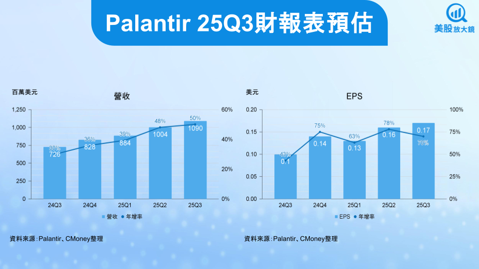 總結來說,Palantir 是 AI 投資浪潮中少數具備「技術 + 商業模式 + 客戶黏著」三位一體優勢的標的,但目前高本益比的情況下,投資人的標準也會跟著提高,因此本次財報的營收及獲利增長幅度將成為影響股價的關鍵。