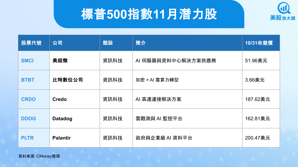 延續 10 月黑馬股,美超微主攻高密度伺服器、機櫃級整合與液冷散熱,長期與 NVIDIA/AMD/Intel 深度協作,強項是「快速客製化+高能效設計」,在 AI 訓練/推論機房滲透度高。近月核心業務持續擴產、機櫃與液冷比重提升,受益於雲端與企業 AI 專案落地;機房整體功耗上升帶動液冷升級週期。投資亮點在於 AI 基建長浪、單客戶大型專案與新品平台迭代帶來的營收彈性。