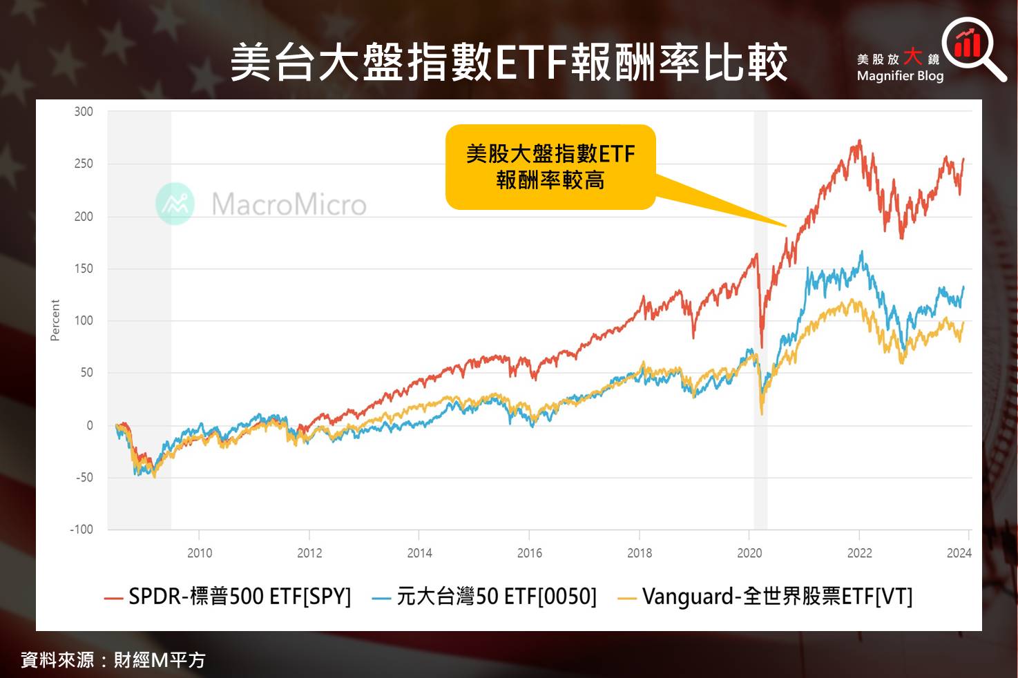 美國大盤指數ETF報酬率顯著高於台灣大盤指數ETF