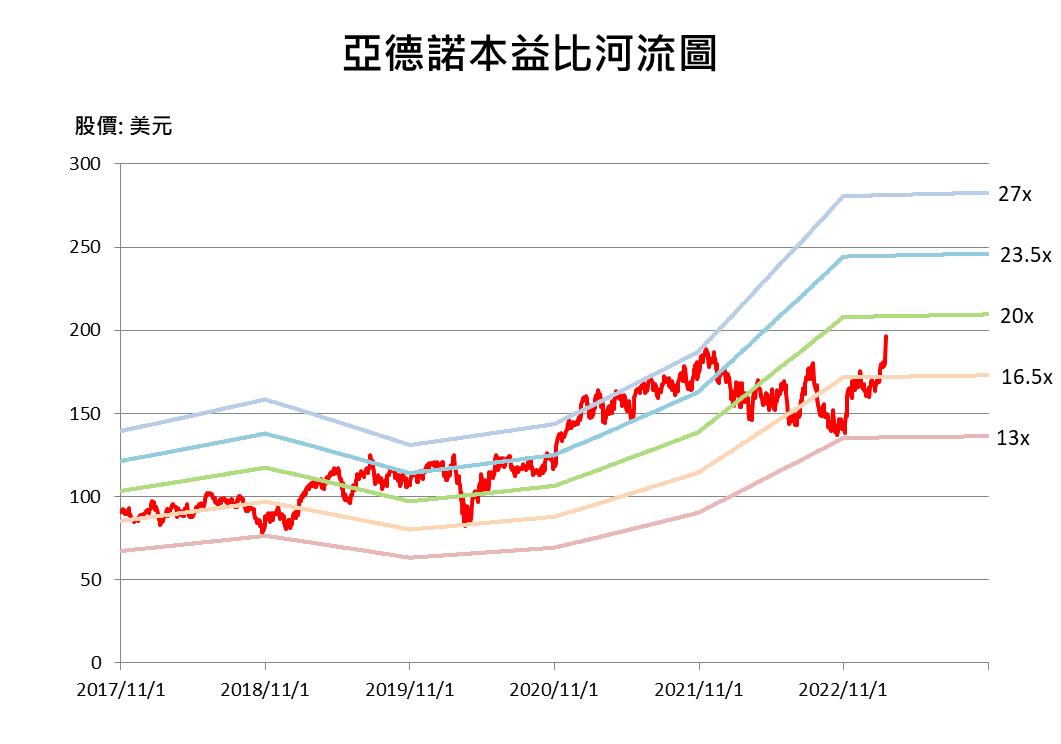 以2023/2/16收盤價193.8美元、預估之亞德諾FY2023稀釋EPS10.68美元計算,目前亞德諾本益比約18倍,參考過往5年亞德諾本益比落於13至27倍間,目前本益比略低於過去5年之平均值20倍。